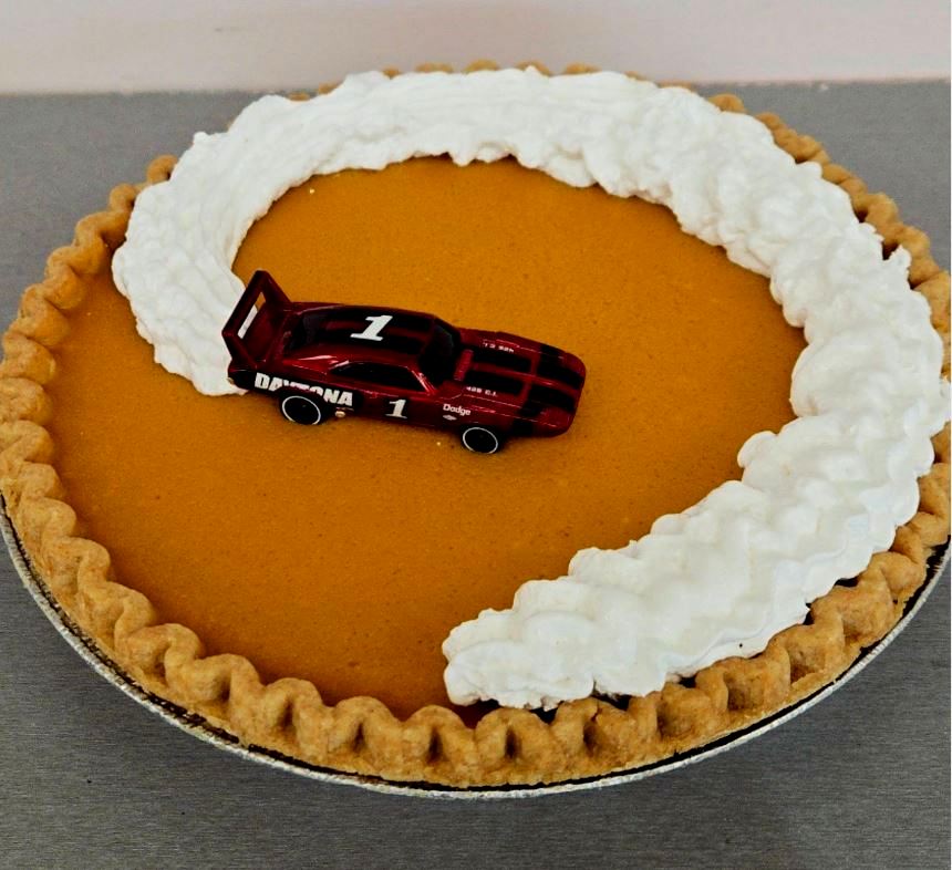 Each pie will have a different, miscellaneous hot rod toy car on top than the photo. 9" Pumpkin Pie with Whipped Topping