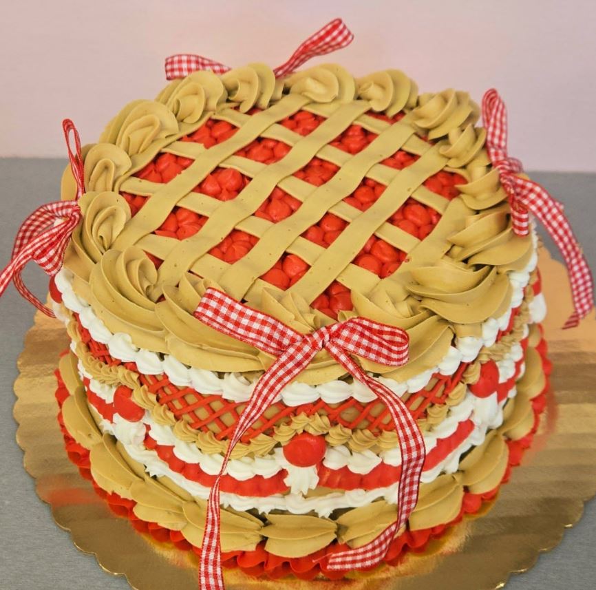 Scrumptious Cherry Cake Layers filled with Cherry Filling and our made from scratch Buttercream.