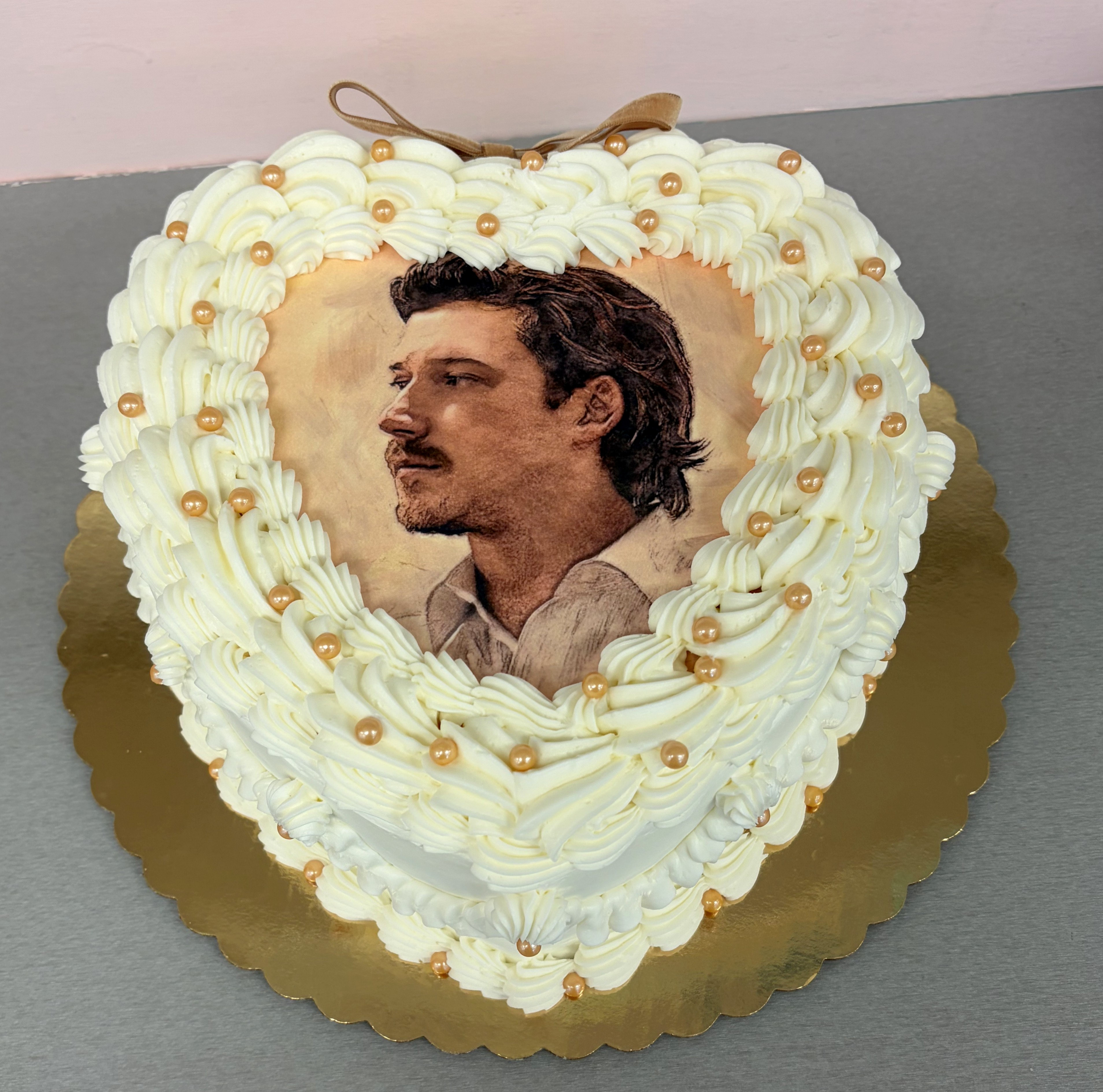 White Icing Decoration with Gold Sugar Pearls. Edible Picture of Morgan Wallen's album cover. The ribbon bow on the back is a velvet, sable colored ribbon. Cake shown is a 9" Heart.